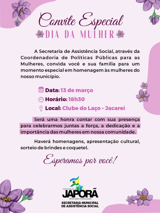 A Secretaria Municipal de Assistência Social, por meio da Coordenadoria de Políticas Públicas para as Mulheres, convida você e sua família para um momento muito especial em homenagem às mulheres do nosso município.